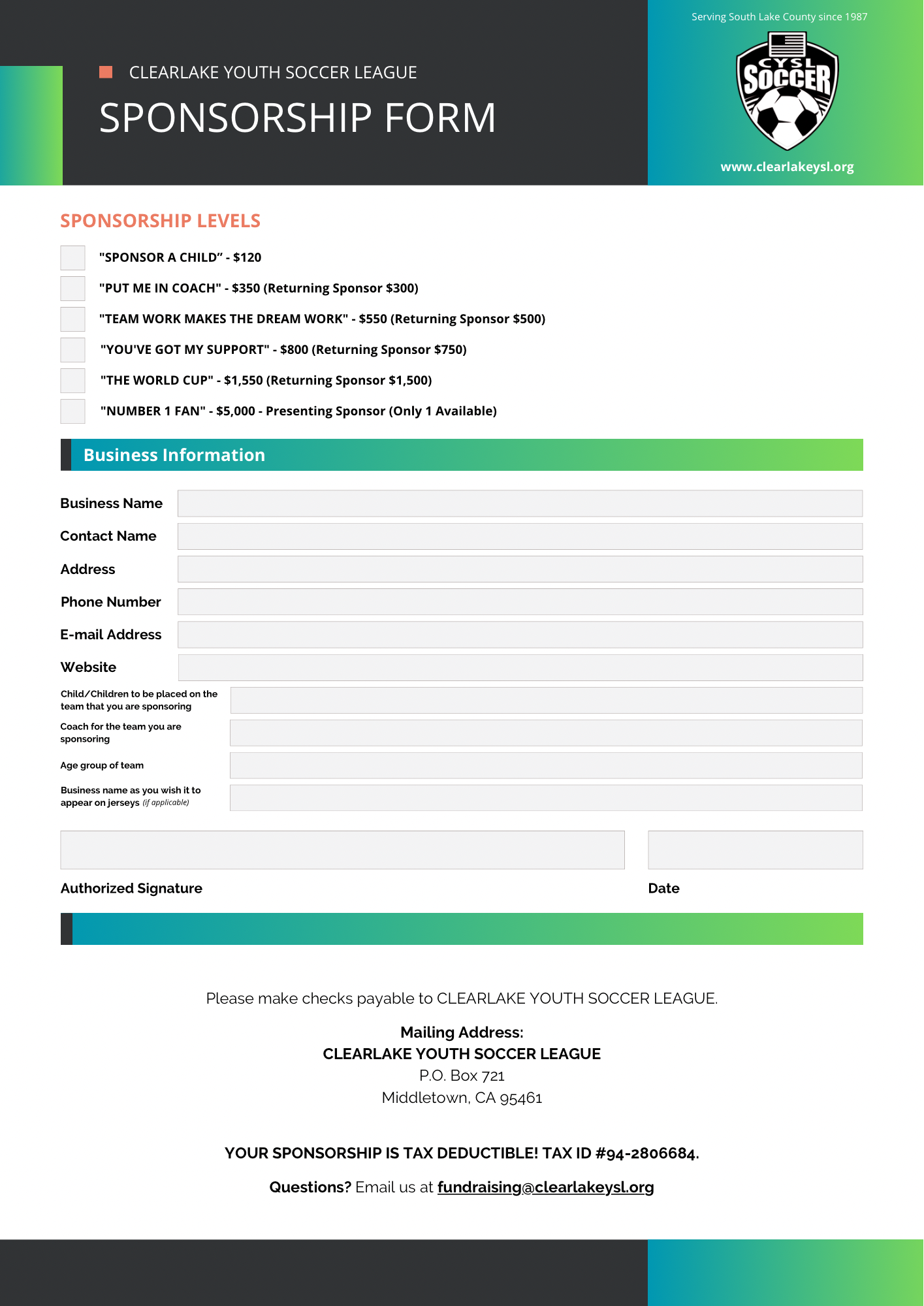 If you have any questions or would like more information regarding sponsorships, please send us a Facebook message or email us at fundraising@clearlakeysl.org.